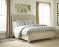 Made with select oak veneer and hardwood solids in a gently distressed vintage parchment white finish. The cases feature heavy mouldings, shaped fronts and framed pilaster mouldings and block shaped legs. Mirror is beveled. Antique brass color ornamental knob. Drawer boxes are clear finished with French/English dovetail and use a side mount ball-bearing glide system. B693-93 night stand has a narrow format with pull-out tray, power strip with USB charger in back. The bed(s) have large scaled frames surrounding nicely crowned upholstered cushion with bands and nail accent. Cushion cover is a textured taupy-gray (beige) color fabric. Select drawers have felt bottoms.