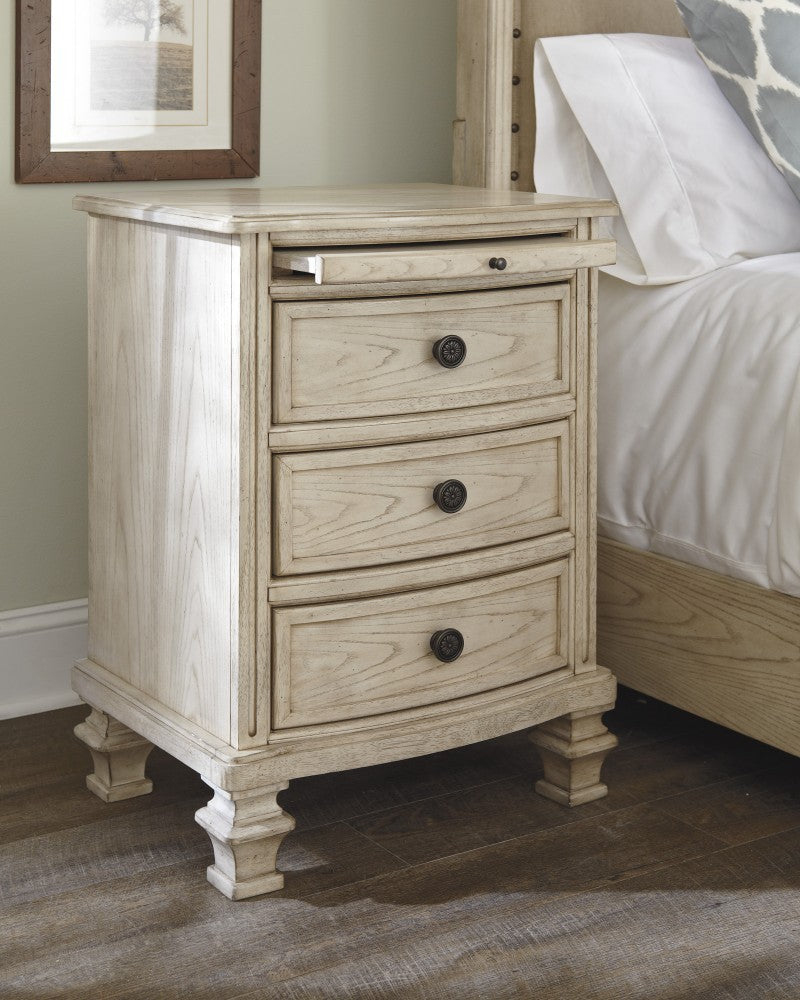 Made with select oak veneer and hardwood solids in a gently distressed vintage parchment white finish. The cases feature heavy mouldings, shaped fronts and framed pilaster mouldings and block shaped legs. Mirror is beveled. Antique brass color ornamental knob. Drawer boxes are clear finished with French/English dovetail and use a side mount ball-bearing glide system. B693-93 night stand has a narrow format with pull-out tray, power strip with USB charger in back. The bed(s) have large scaled frames surrounding nicely crowned upholstered cushion with bands and nail accent. Cushion cover is a textured taupy-gray (beige) color fabric. Select drawers have felt bottoms.